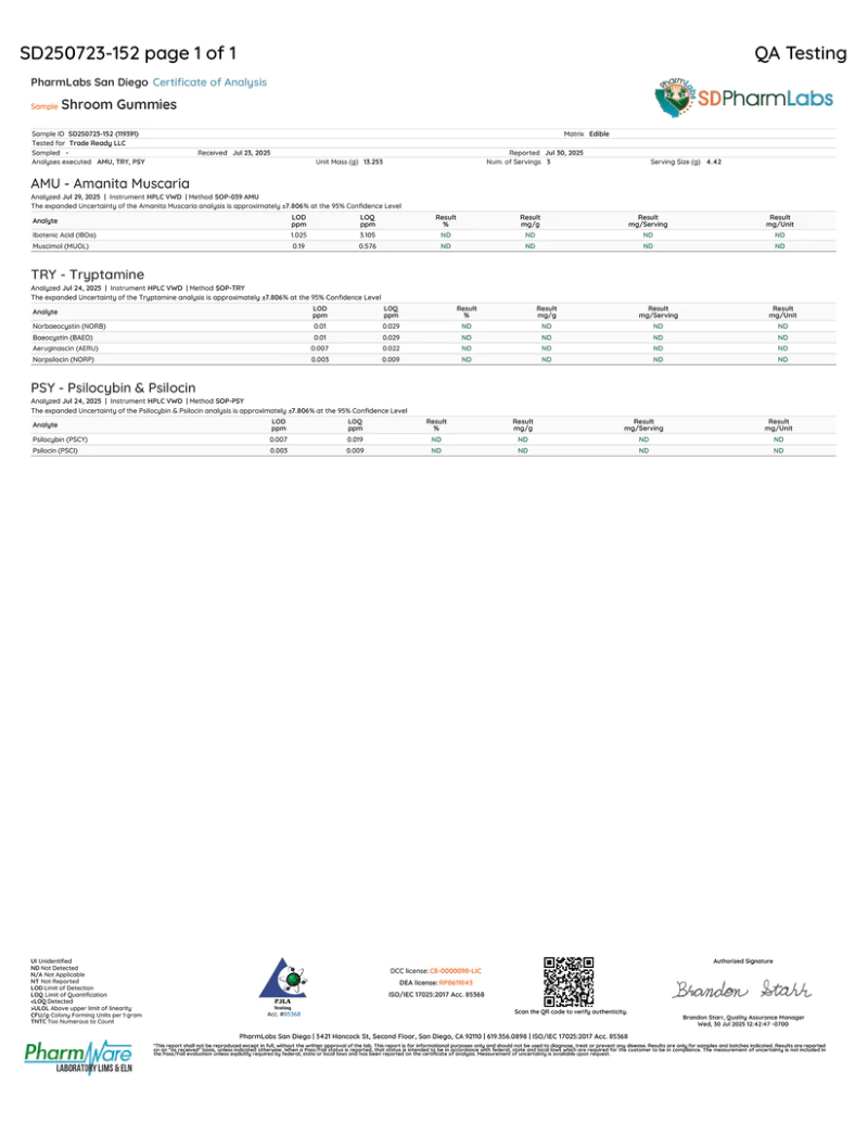 Each gummy is packed with 350mg (½-gram dry equivalent) of Non-Detect mushroom extract, meaning you get the chill, the aesthetic, and the mushroom magic without any detectable psilocybin, psilocin, 4-ACO-DMT, cannabinoids, or weird lab chems.